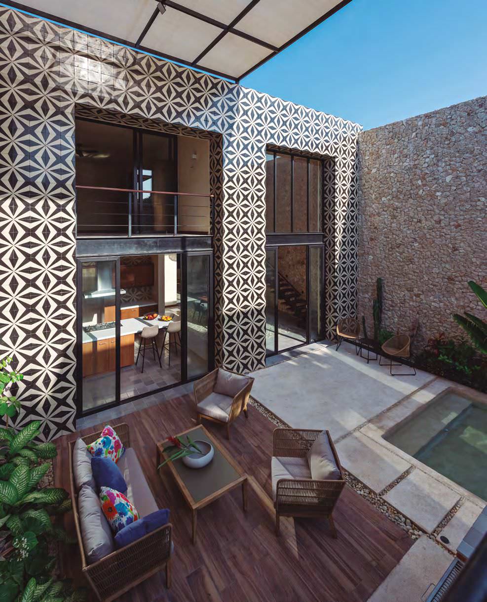 El volumen del acceso peatonal fue realizado a base de block y recubierto con mortero de cemento blanco con resina de chukum para tener una apariencia más acorde con el contexto Al ingresar a la casa lo primero que se veía era el espacio destinado a la sala, seguido por el comedor y al fondo, el patio. Estas áreas contaban con un piso de pasta de diferentes tonos (azul, rojo y blanco), el cual se sustituyó también por pisos de pasta, pero de tonos más uniformes y sobrios con escalas de grises y azules. La distribución de espacios se planteó en torno al patio central procurando siempre las vistas hacia éste.