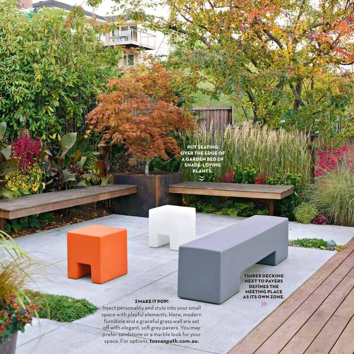 Inject personality and style into your small space with playful elements. Here, modern furniture and a graceful grass wall are set off with elegant, soft grey pavers. You may prefer sandstone or a marble look for your space. For options, tuscanpath.com.au.