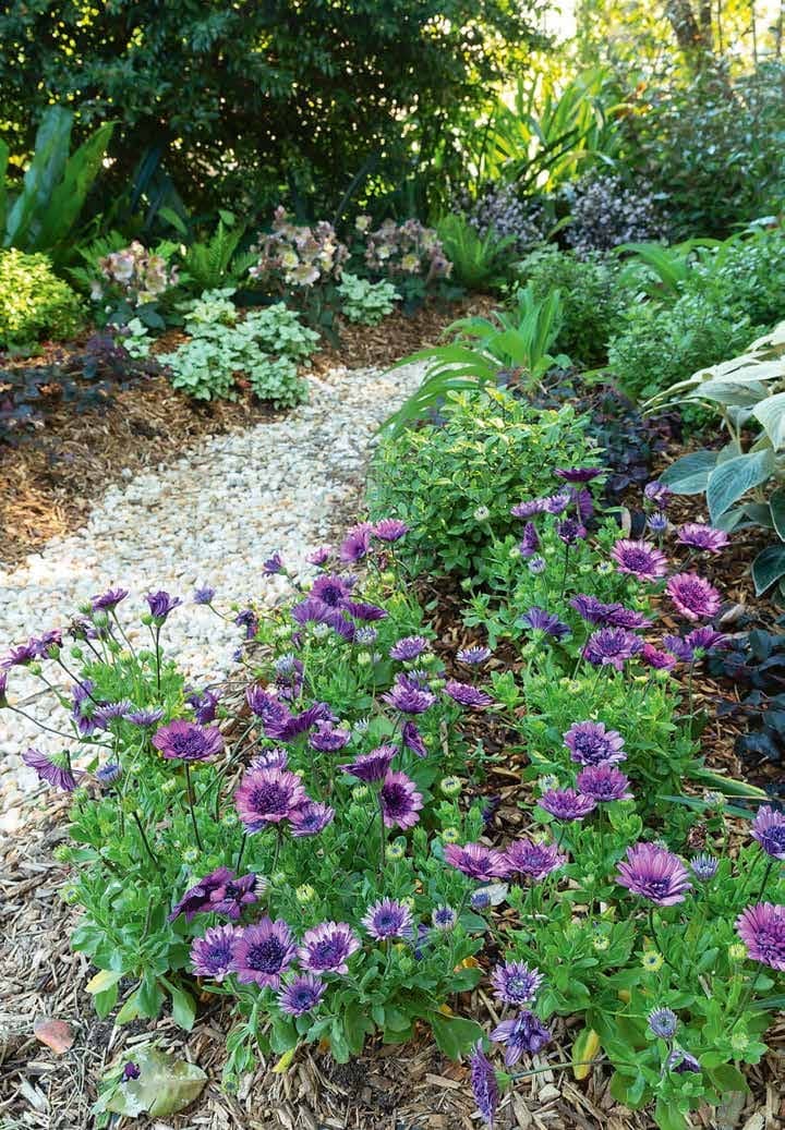 LIGHT UP SHADY SPOTS IN YOUR GARDEN WITH STROBILANTHES’ SILVERY LEAVES WHICH HOLD UP SOFT LILAC FLOWER SPIKES IN SPRING AND ALSO INTRODUCE THEIR GORGEOUSLY PURPLE NEIGHBOURS – THE LONG-LASTING AFRICAN DAISIES OSTEOSPERMUM ’ D’