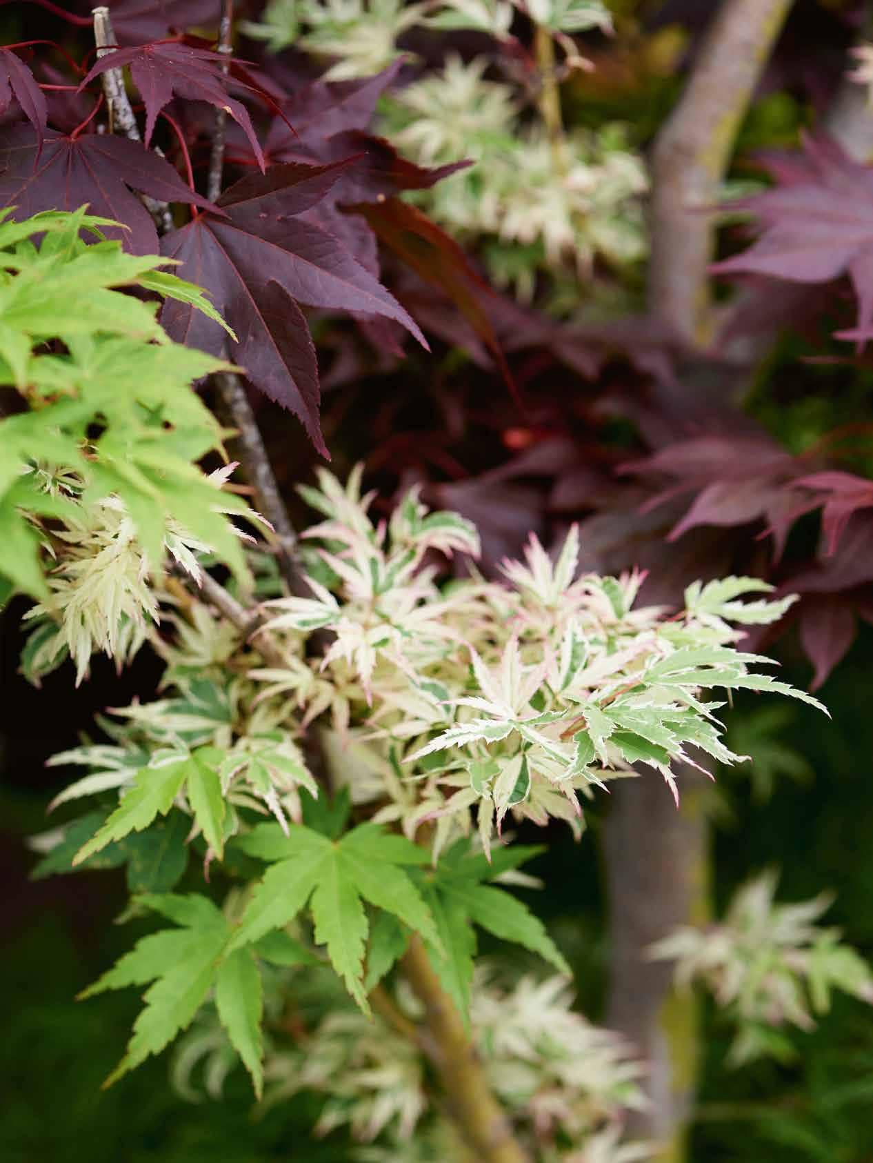 There are so many leaf shapes and shades with maples that when you let them mingle you can create light and colour without flowers. Try bleached A. palmatum 'Wallies' against the deep maroon 'Shaina' and limey 'Hanama Nishiki' for drama!