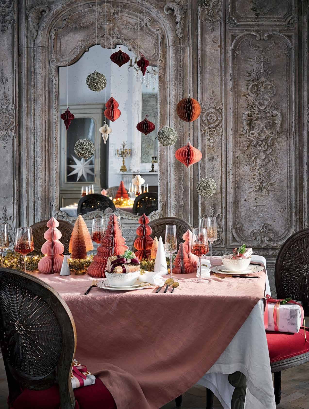 A garland of green, fairy lights and paper tabletop trees add up to a magnificent centrepiece for a sit- down celebration. A white and a pretty coral and blush tone-on-tone colour scheme is as elegant as it is glam!