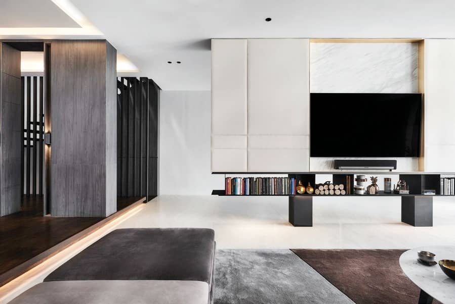 Entering the home, the sharp contrast of black and white is immediately noticed, where the white homogeneous stone-effect floor tiles from Hafary are paired against two strikingly elegant slabs of marble and other black-accented fixtures and furnishings. This crisp contrast is also repeated throughout the space, which offers up visual consistency as one moves through the home. Meanwhile, large windows dotted throughout the home flood space with daylight.