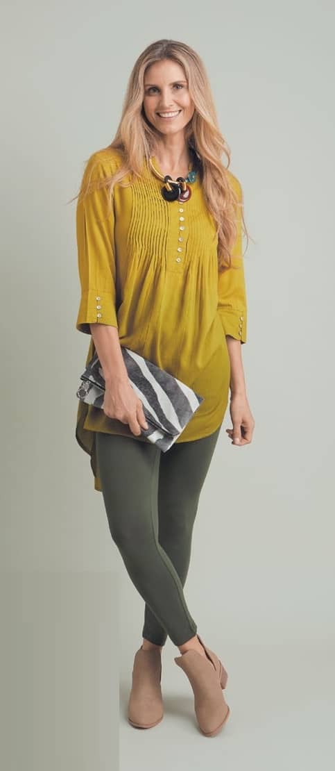 CHARTREUSE LONG TOP, R625 | KHAKI THREE-QUARTER LEGGINGS, R320 | TAN ANKLE BOOTS R599, Cotton On | SOFT VELVET ZEBRA PRINT CLUTCH BAG WITH ZIP R400, Rona Jessie