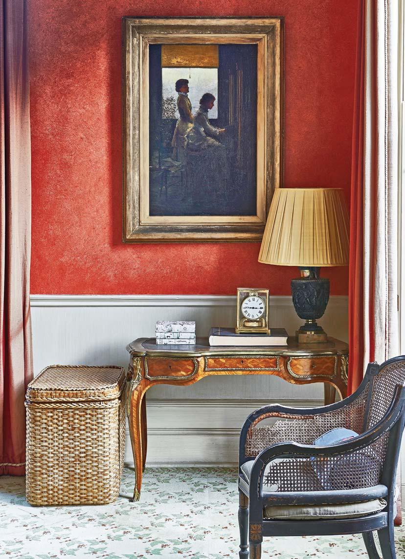 When Izzy and Will moved into their new home, there were an unexpected number of fixtures left by the previous owners. Antique furniture filled the grand entrance hall and decades-old Colefax and Fowler wallpapers adorned the walls of bedrooms. Too beautiful to be torn down and worthy of being labelled archival or vintage at the very least, Izzy decided the paper should stay, as should the antiques, some of which had graced the panelled hallway since the 1970s. Will's affinity to these in particular was strong, not surprisingly, as the house was in fact his former childhood home. 'Will's parents moved here in 1979, and he and his three older sisters grew up in the house,' says Izzy. When his parents retired to the Isle of Wight, the newly married Will and Izzy took responsibility for the adjoining farm and moved into the house.