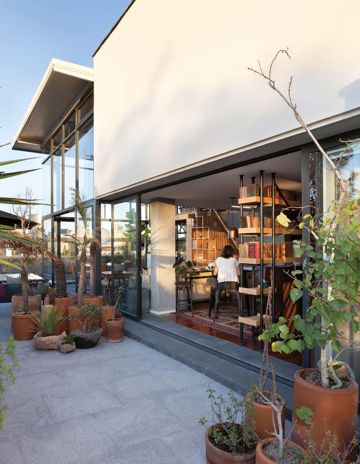 Con vistas de 360° a cerros y sierras, la terraza conecta con el horizonte. En contraste, el interior ofrece atmósferas rojizas y patios ajardinados que invitan a una vida íntima y pausada.