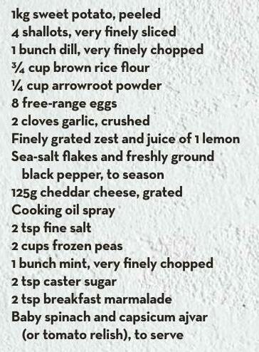STEP 1 Coarsely grate sweet potato, then squeeze e well with hands to remove excess water. Put in a bowl and mix with shallots and dill. Combine rice flour and arrowroot in another bowl. Whisk 4 of the eggs, garlic and zest in a third bowl. Toss flours with sweet potato, then stir in egg mixture. Season. Stir in cheese.