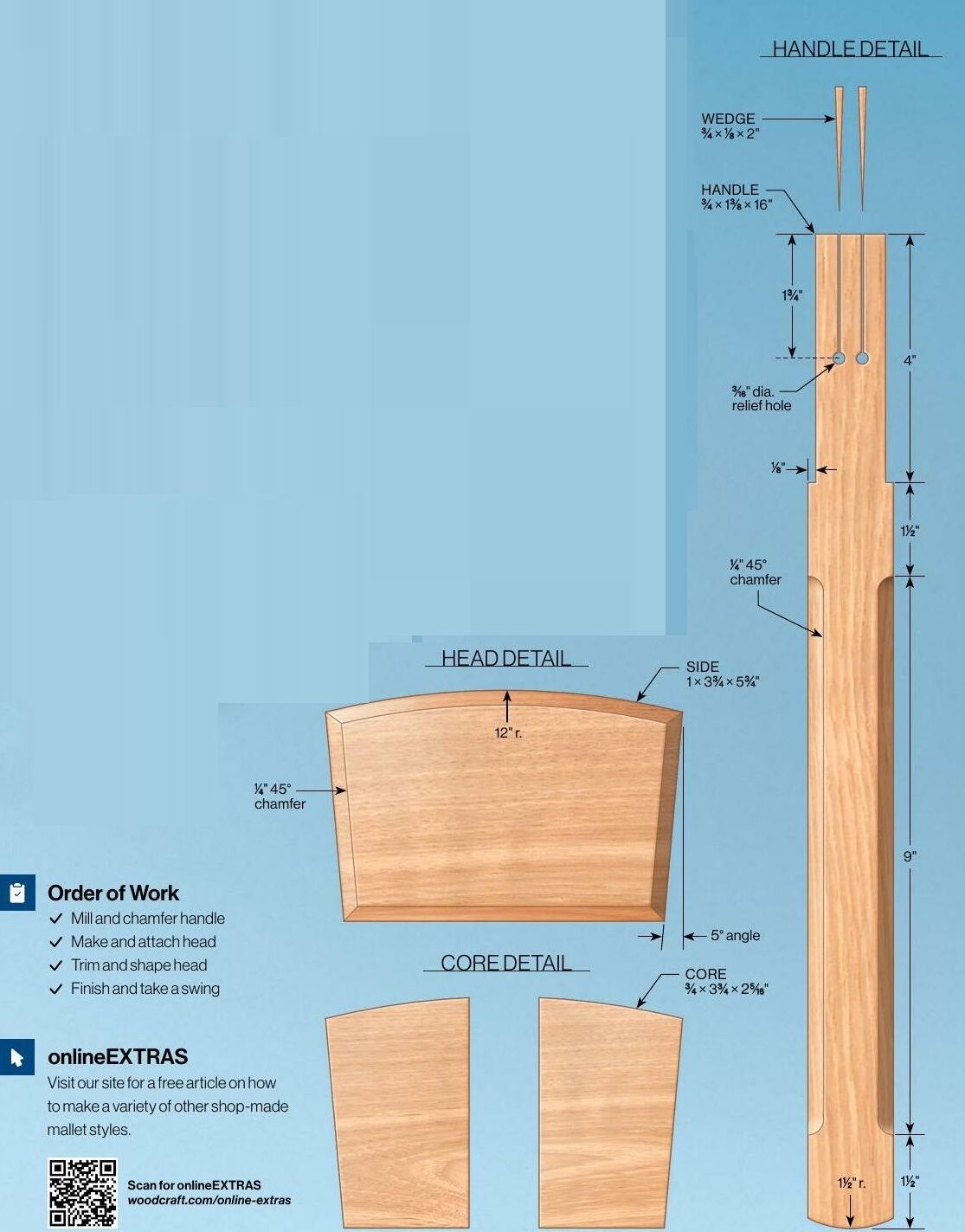 What’s more, this is a tool you can make for yourself, customizing it to suit the way you work. I’ve specified the dimensions I used, but feel free to shorten the handle if you frequently find yourself choking up and swinging from the wrist rather than the elbow. Increase or decrease the head size to suit your common tasks. Or use heavier woods or added weight to increase the mallet’s mass for more power. Better yet, make an entire set in various lengths, weights, and head sizes—each suited to a task. Even if you just make one, your shop will be the better for it.