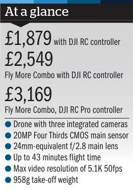 The DJI Mavic 3 Pro has all the features of the Mavic 3, but it has three cameras mounted via a mechanically stabilised gimbal, instead of two. As with the Mavic 3 and Mavic 3 Classic, the Mavic 3 Pro’s main camera was developed in tandem with Hasselblad and has a 20MP Four Thirds type sensor fronted by a 24mm equivalent lens. This is joined by a 48MP telephoto camera with an equivalent focal length of 70mm and a 1/1.3in type CMOS sensor, and a 12MP 166mm equivalent camera with a 1/2in type CMOS sensor.