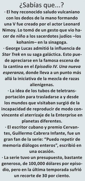 La serie creada por Gene Roddenberry en 1966 ha quedado hoy como el lejano punto de origen de un big bang. Nadie podía prever en el momento de su estreno que su expansión se extendería al mundo del cine, a nuevas series de televisión con otros protagonistas y a tramas situadas en diferentes décadas, pero siempre dentro del crisol de razas y galaxias en el que se movían los protagonistas originales. Y todo por una serie de televisión que, según se ha dicho siempre, fue cancelada por su escaso número de espectadores.
