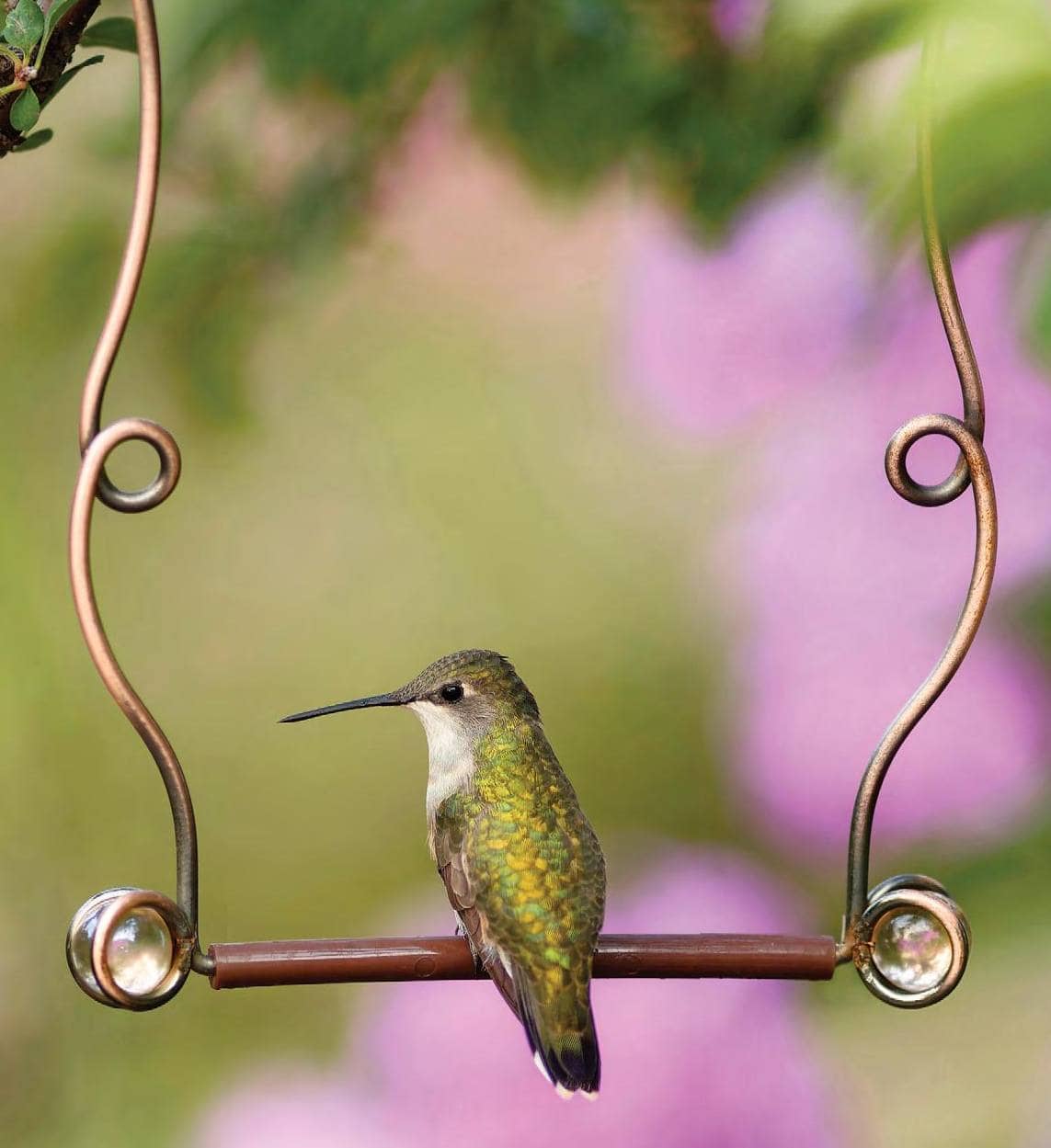 A perfect perch could be a high, thin branch left to grow beyond the main growth of shrubs. Another option is purchased or homemade swings constructed from wire. Hang them on small trees or posts near nectar-producing flowers and sugar-water feeders, but high enough off the ground to protect from predators such as cats.