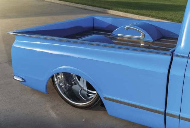 With the truck tucked safely in his garage, Henry began planning his vision for the build. The plan was to make a mix of modern muscle with a touch of classic styling. Before long, Henry contacted Justin Arnold, the owner of Air Art/Custom Justin in Bridge Creek, Oklahoma, and made the plans to start tearing down the truck. Justin first removed the body from the frame so that he could lay the rockers of the truck on the ground. A Choppin’ Block chassis was swapped out from the stock frame with the help from the guys at 405 Kustomz in Tuttle, Oklahoma. A set of Slam Specialties RE7 bags were chosen for all four corners of the truck to give it the maximum lift. Custom half-inch stainless steel hard lines were fabricated to line the frame and give a clean install look. To finish up the list of items for the frame was a custom aluminum polished gas tank that was fitted up between the rear frame rails.