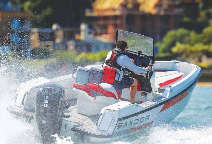 Perhaps that’s hardly surprising given that the man behind Saxdor, Sakari Mattila, was also one of the founding partners of Axopar before cutting ties with them and setting up Saxdor as a completely unrelated company. That said it’s not hard to draw parallels between Saxdor and Axopar; they are both Finnish-owned and built-in Poland, with edgy styling, vertical bows, outboard engines and competitive prices. Very competitive in the case of the Saxdor 200. This 20ft sportsboat, complete with a 100hp Mercury engine and a standard spec that includes nav lights and an adjustable windscreen, retails for £22,158 inc VAT on the water in the UK. That’s less than the cost of a hydraulic passerelle on a Princess V55!