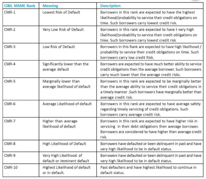 CIBIL MSME Rank is a tool to Access the Credit Risk ranking of Micro, Small and Medium Enterprises to make informed lending decisions, CMR is a credit risk for MSMEs that predicts the probability of an MSME becoming NPA in the next 12 months. It helps us to understand the credit behaviour of MSME as well as the probability of default based on the rank. It is applicable to MSMEs with aggregate commercial borrowing between Rs 10 lakhs to Rs 10 Crores.CMR provides a rank to the MSME based on its credit history data on a scale of 1 to 10.CMR 1 being the best possible rank for the least risky MSMEs and CMR 10 being the riskiest rank for MSMEs.The lower the CMR, the lower the Risk of NPA associated with the MSME.