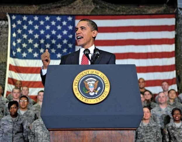 In his March 2009 speech, Obama said U.S. Troops were in Afghanistan to “Disrupt, dismantle and defeat Al-Qaeda.” Here, U.S. soldiers from the 3rd Brigade, 10th Mountain Division take cover as a Blackhawk helicopter takes off on May 24, 2009 in Wardak Province, Afghanistan, southwest of Kabul.