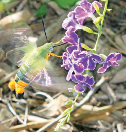 The glorious butterfly bush in front of her home attracts hummingbird moths, butterflies and countless species of native bees and wasps. Luli has planted oleanders, hibiscus, which die back in frost but regenerate, kangaroo paws, star jasmine, drought- and frost-tolerant daisies, geraniums, daylilies, a climbing honeysuckle and marigolds, which are annual but self-seeding.