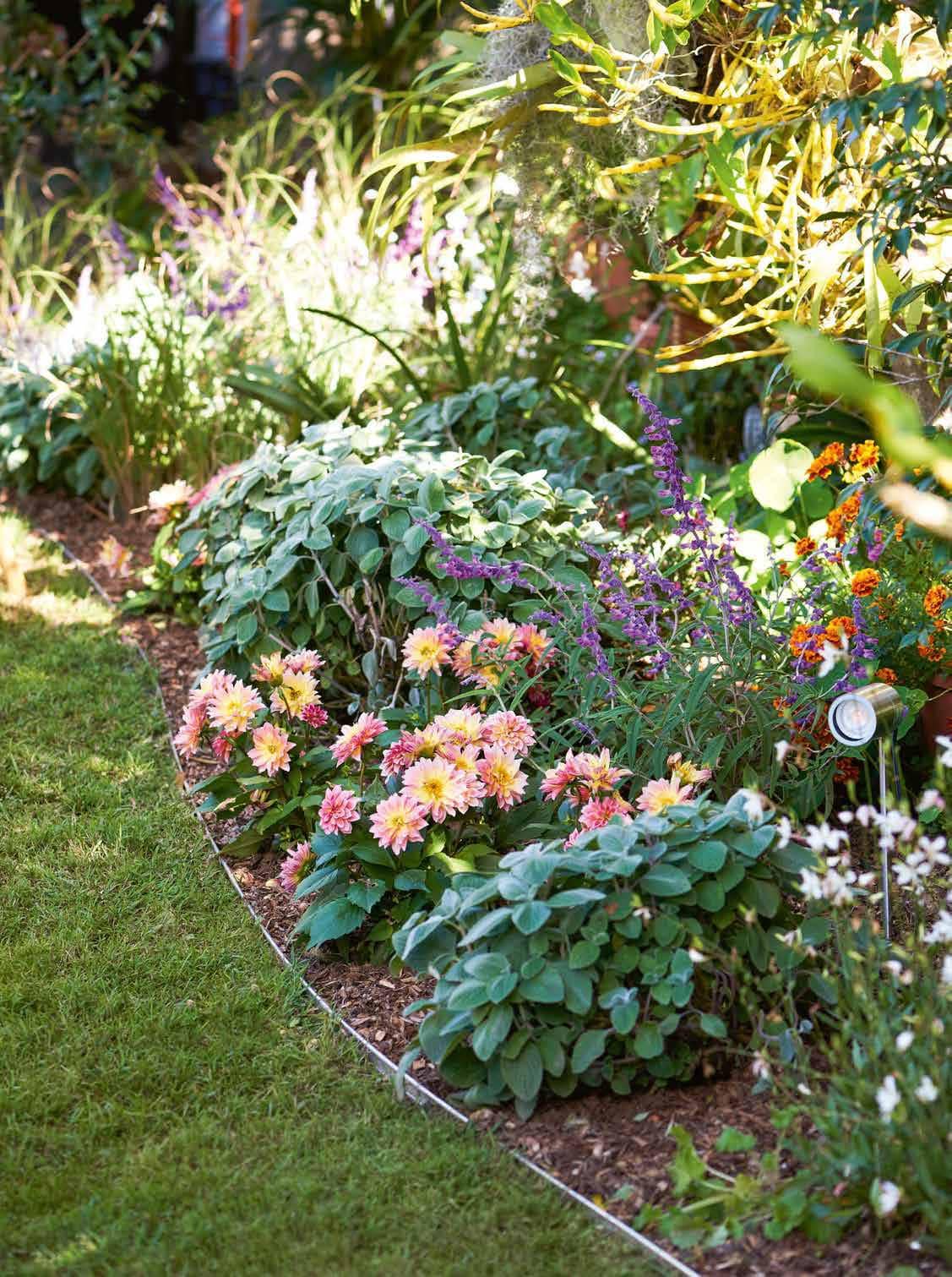 Curved edging separates the lawn from the garden bed mulch, allowing the dahlias and Persian shield shrubs to flourish with their share of nutrients and water.