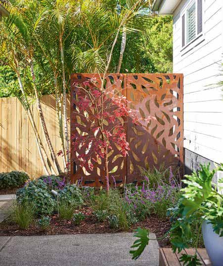 Erect a decorative screen - like these weathered steel panels from the hardware store - to hide ugly essentials such as wheelie bins without making access difficult.