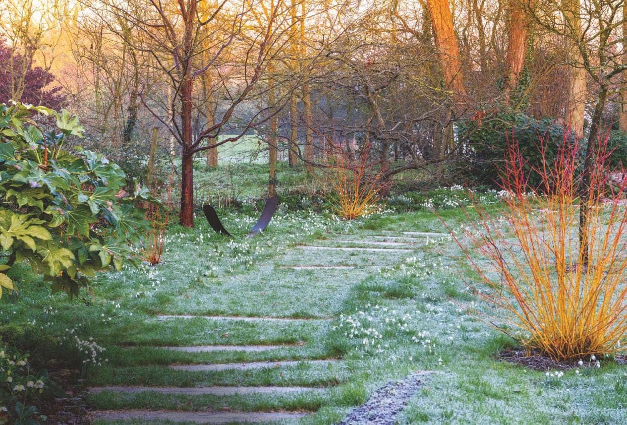 Flaming red and gold stems contrast spectacularly with carpets of frosty snowdrops in Jackie and John Copping’s cottage garden in Essex