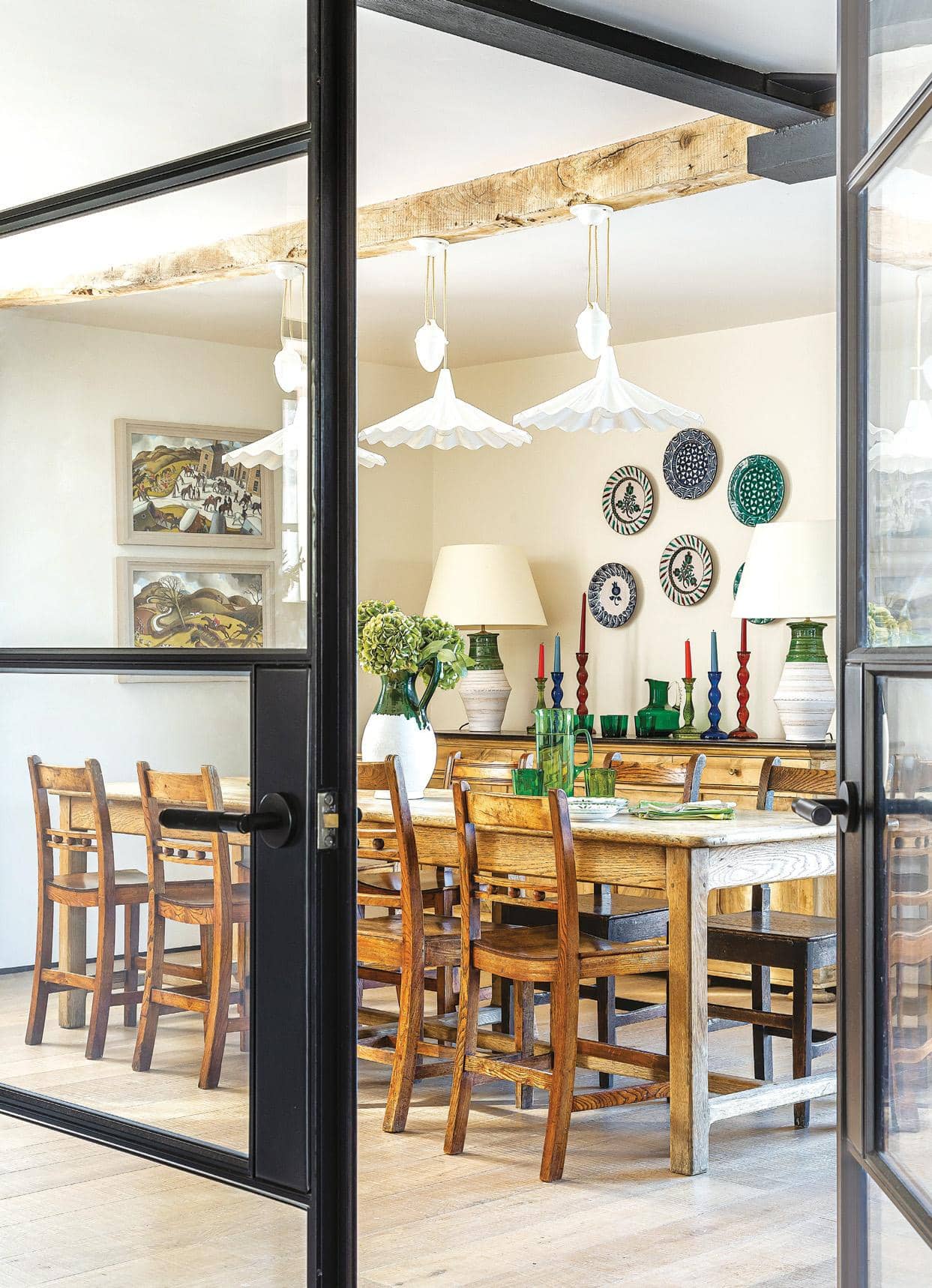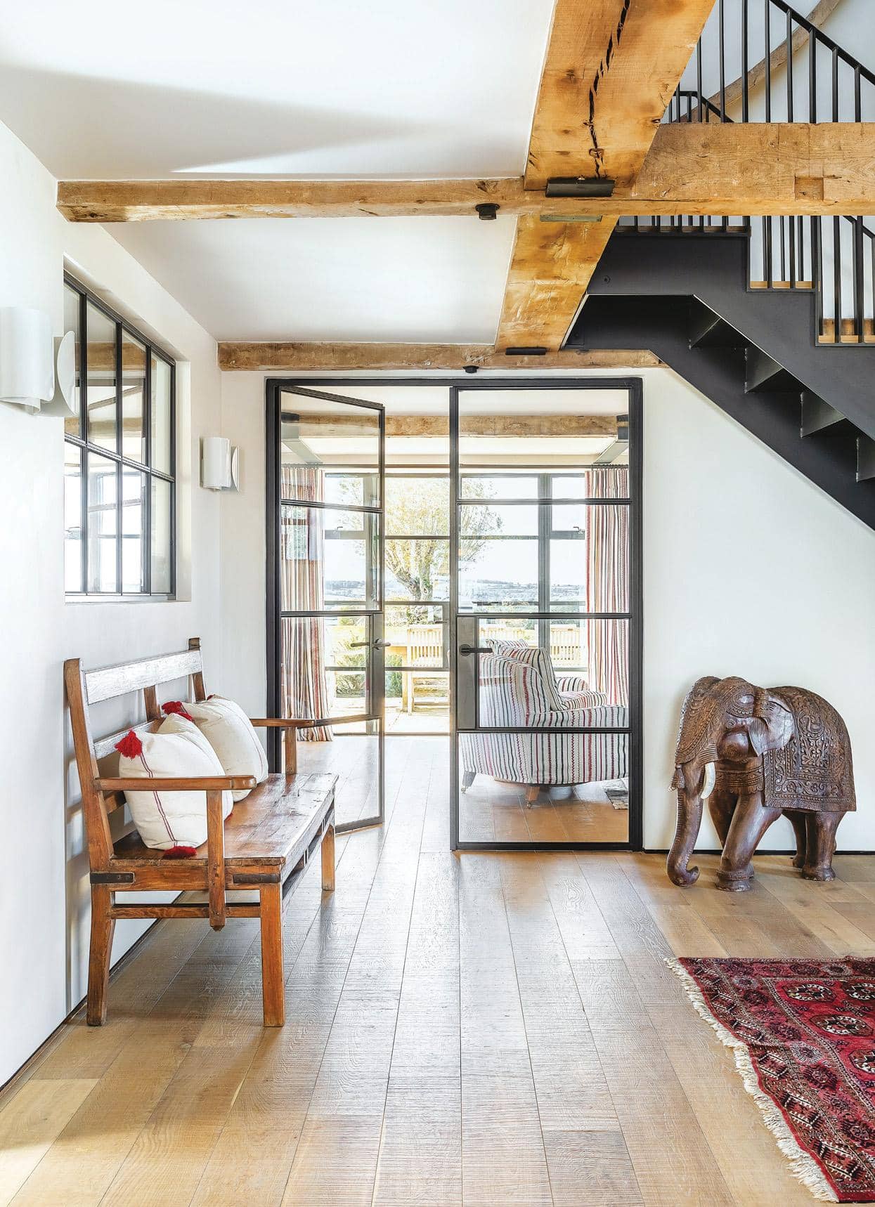 A black steel beam and Crittall doors punctuate the mellow palette of stone and timber and are complemented by a striking statement charcoal drawing. Table, La Maison Chic. Antique rug and artwork, both Lorfords. Glass pendant, The Decorative Antiques & Textiles Fair