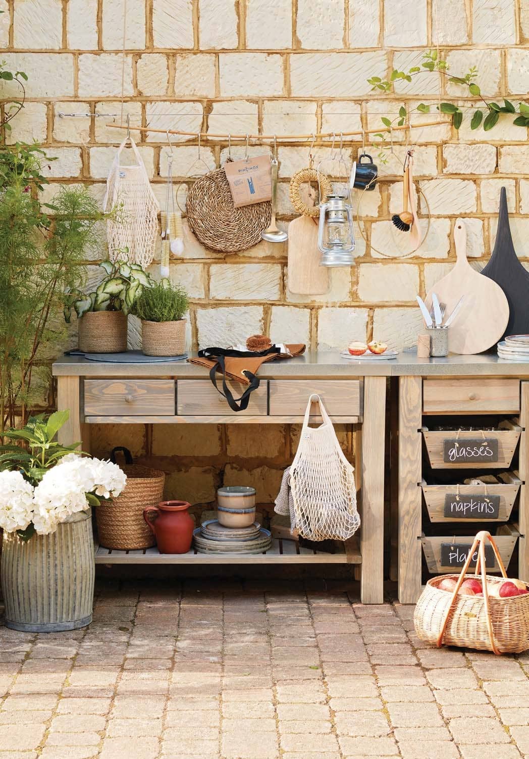 Extend your kitchen capacity into the garden. Potting tables provide a slim, compact surface along one side of a patio for outside food prep.