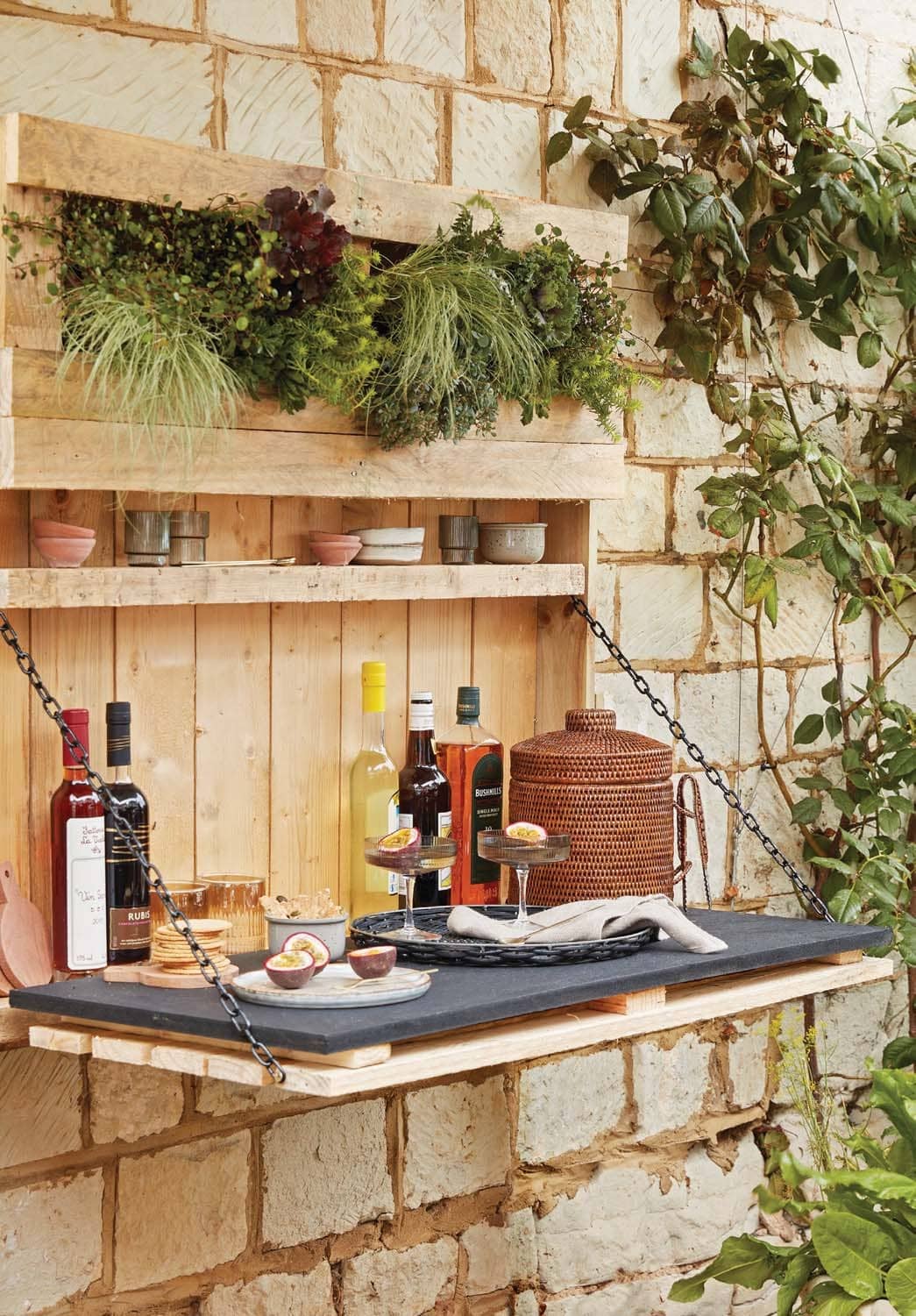 Create your own little entertaining zone with a clever pull down bar made from a couple of pallets and lengths of chain.
