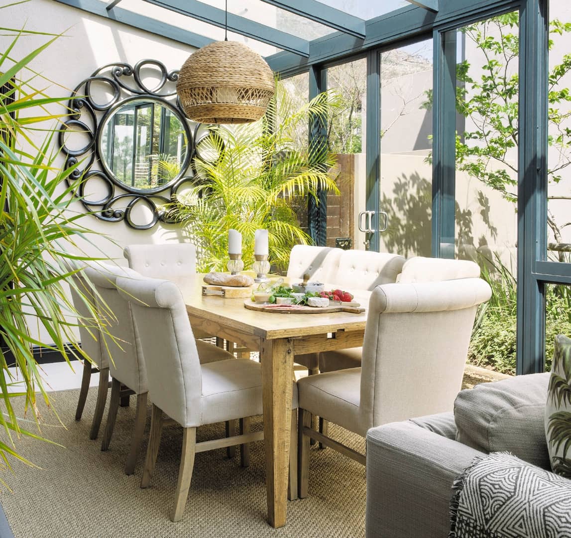 Before moving in, Andrea and Steve demolished the existing built-in braai separating the patio from the backyard and cast a single slab over both areas so that a conservatory could be constructed on a slightly elevated platform. “This has transformed the house, providing extra living space for a wonderful, easy lifestyle,” says Andrea. “I love cooking and entertaining and having my children over for Sunday lunch. A table that was too big for the living area fits perfectly into one end of the conservatory so we can look out at the garden and, in the evenings, when the blinds are open, enjoy the stars.”