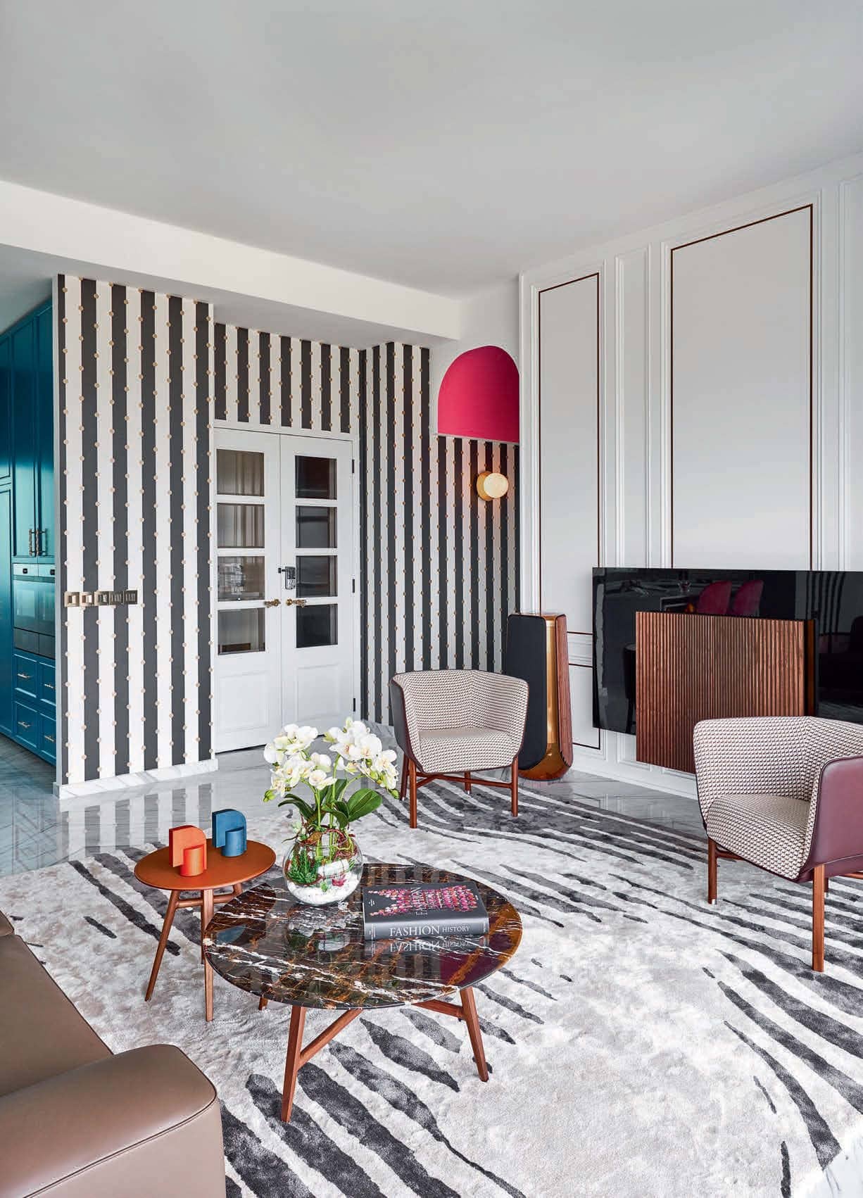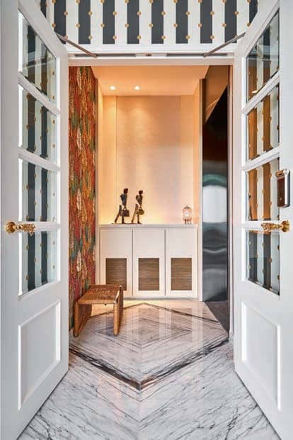 A pair of French doors was specially chosen to allow natural light to illuminate the entrance foyer. Elegant furnishings from Hermès, including a leather sofa, armchairs and marble coffee tables, evoke a sense of understated luxury in the living area. The designers also installed a spray-painted wall feature as a complementary backdrop to the Bang & Olufsen TV and speakers.