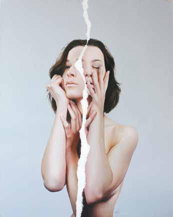 Artist Grant Gilsdorf admits his work might feel edgy and challenging to viewers but he has always prioritized authenticity over mass appeal. Instinctually, comfort and complacency have always registered as dangerous to my creativity,” he says. I find myself constantly pushing new boundaries and testing the fortification of previously established ones...I’m not interested in a casual interaction with art, rather my works stimulate an emotional or intellectual response, and often those responses originate from the intersection of unease and beauty.” His painting Three Weary Graces is his personal take on the three Graces,” goddesses of Greek mythology whose personification of grace, beauty and charm have inspired artists for centuries. In Gilsdorf’s version they are depicted as depleted and haggard, but a small gold thread of hope remains. Inspired by the pandemic that forever changed our lives, Fractured depicts a moment of transformation—the new that is emerging and the vestiges of the past that remain.
