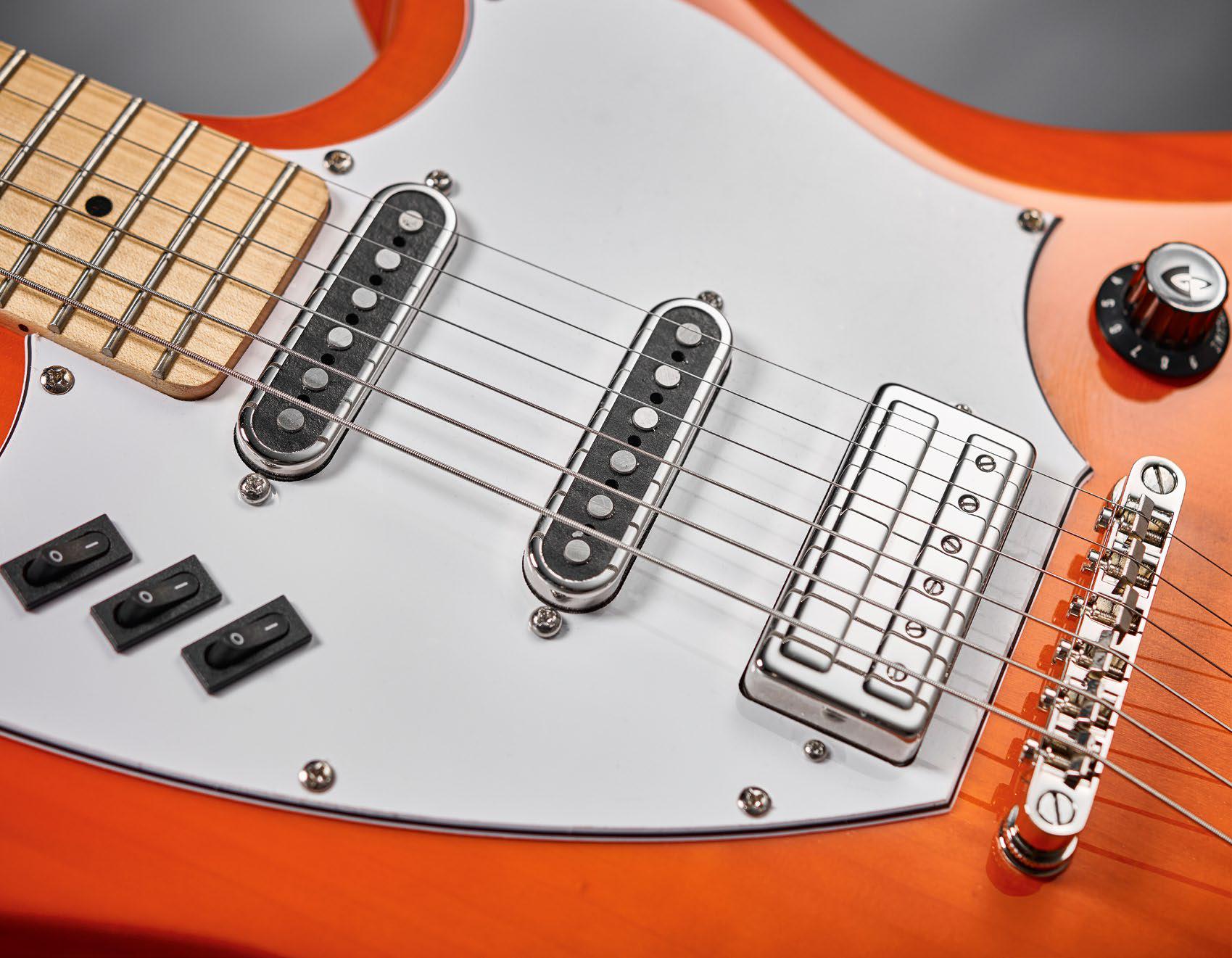 The Surfliner is also completely unique to the Guild range in that it's an original design and, for the most part, a pretty good one at that. Based around a Fender-style 25.5-inch scale length the Surfliner sports a lightweight poplar body; our sample is a four-piece spread and you can see some light grain through the transparent Sunset Orange gloss finish, one of three currently offered.