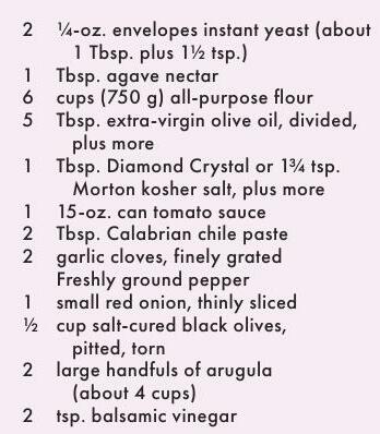 Lightly oil your hands. Uncover dough and dimple all over with your fingers, pressing fingertips firmly into dough. Spread tomato sauce mixture over dough; scatter red onion and olives over.