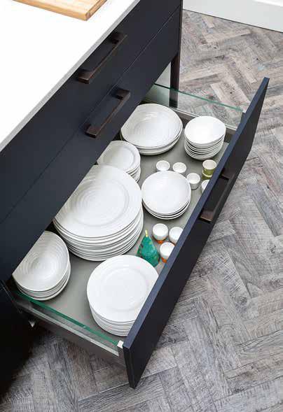 Store your dishes and crockery in sturdy and deep drawers located as close as possible to your dishwasher or sink so you're not walking back and forth with piles of plates. For secure storage, look to plate holders or plate pegs.