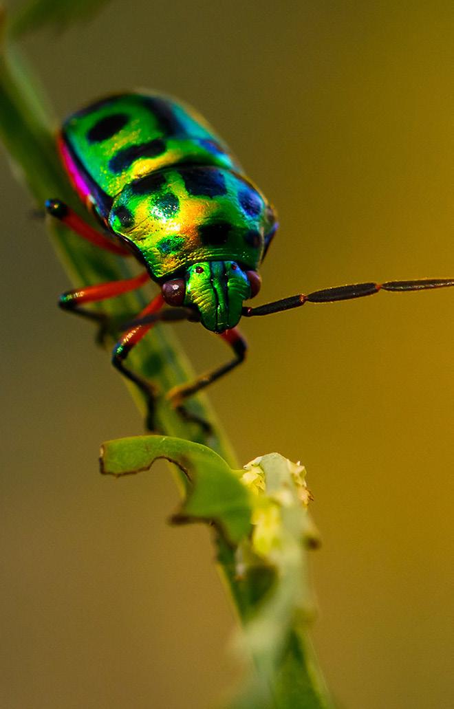 Este chinche escudo de la familia Pentatomoidea brilla como una piedra preciosa, por lo que en inglés se llama "jewel bug" (bicho joya).