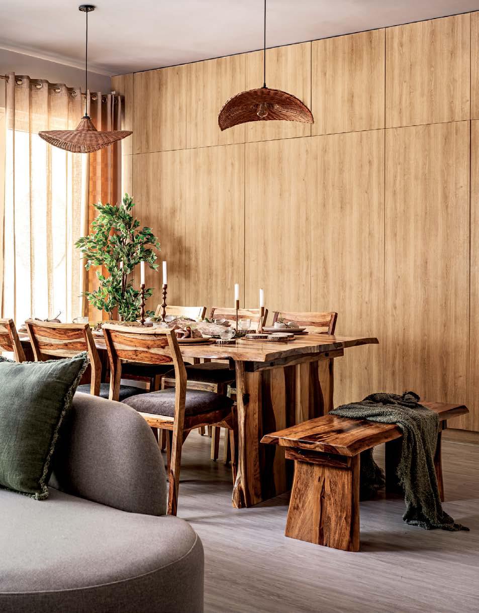 This design aesthetic follows shizen, a Japanese term that values the intrinsic beauty of nature and the appreciation of things in their natural state. Therefore, we have used organic materials and textures such as wood, concrete and stone, as far as possible in their natural states. Live edge furniture, where the natural edge of the tree is both visible and incorporated into the design of the piece along with branches as decor in its original shape, knots in the wood and wrinkles in the linen are examples of the natural look.