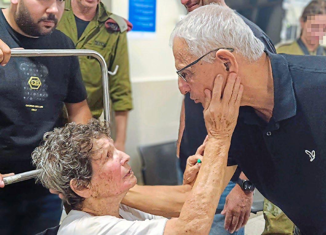 Speaking in Hebrew, with her daughter translating, she told reporters this morning that they were hit with sticks by Hamas militants and taken into Gaza on the back of a motorbike, with her legs on one side and her hands on the other. The elderly hostages were then forced to walk for several kilometres on the wet ground of the tunnels.