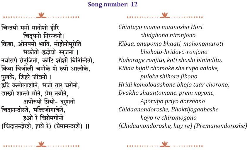 His conversations with devotees were interspersed with songs that drove home the point of discussion and intensified the spiritual mood of the gathering. Sri Ramakrishner Priyo Sangeet is a collection of songs that were sung by Sri Ramakrishna or sung in his presence by others. In this section we serialise these songs giving the English and Devanagari transliteration of the Bengali song, along with its English translation.