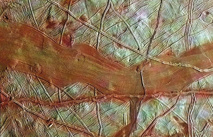 The process behind the creation of Jupiter’s largest moons is still hotly debated, but astronomers largely agree that they formed from leftover debris from the formation of Jupiter roughly 4.5 billion years ago. Fast-forward to today and Europa is a water-ice ball with fractures criss-crossing all over the surface. The number of craters currently found across its cracked terrain indicate that the moon is no older than 90 million years old, suggesting there is likely to be some form of surface replenishment that also brings salts and sulphur compounds to the outer layer. Surrounding the icy world is a thin atmosphere composed of molecular oxygen.