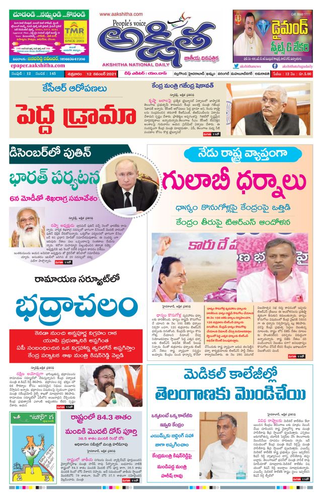 Akshitha National Telugu daily newspaper. Published from Hyderabad. Every Monday Holiday so newspaper is not published.