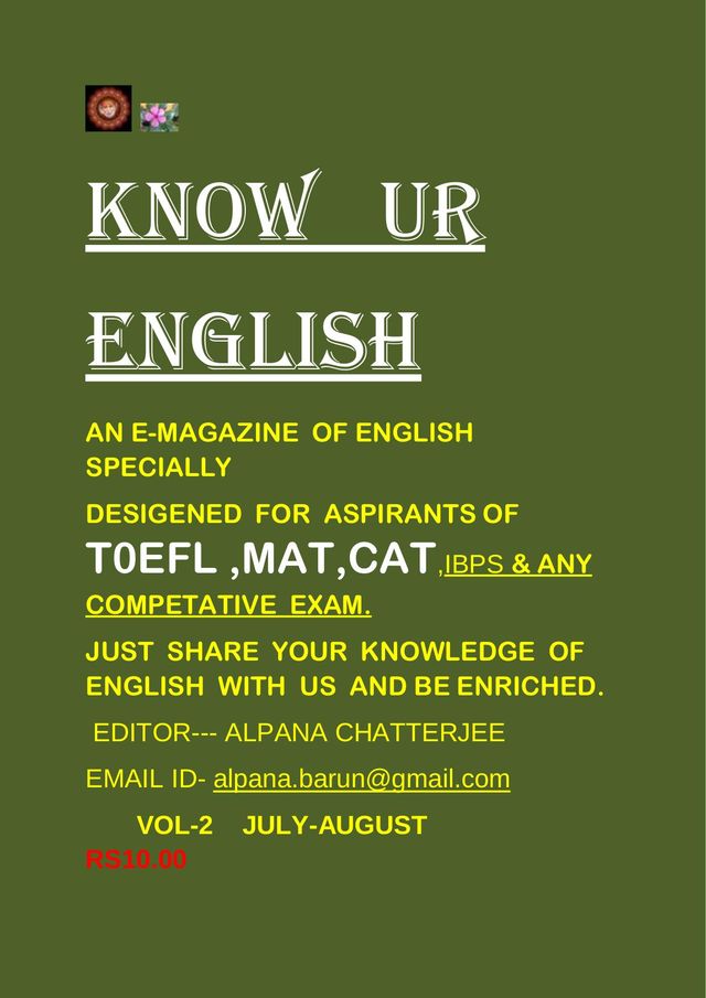 ‘KNOW UR ENGLISH’ e-magazine of English is a bimonthly magazine for the aspirants of TOEFL , MAT,CAT and competitors of IPBS , UPSC and any type of competitive exams. English is one of simple and widely accepted languages in the World. Now-a-days, TOEFL is the gateway for higher eduation .