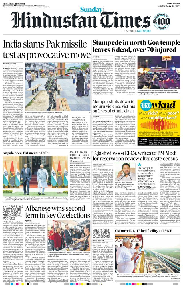 Hindustan Times is the flagship publication of HT Media Ltd. It has a nationwide reach in India (barring Southern India), with simultaneous editions from New Delhi, Mumbai, Lucknow, Patna and Kolkata, providing general, economic and business news.
