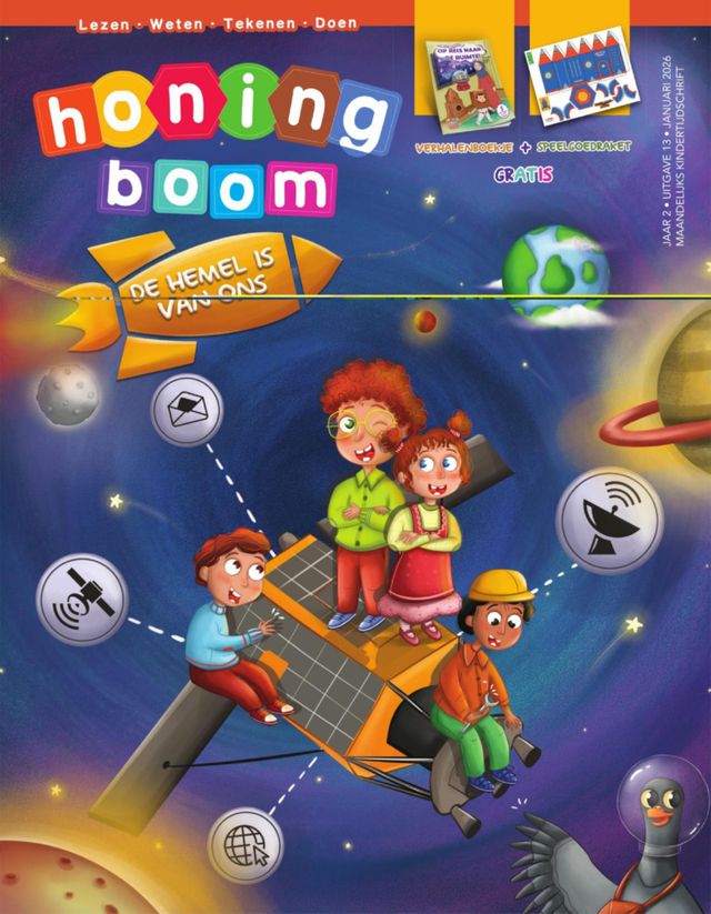 De techniek is steeds beter geworden, en daardoor ook de manier waarop we met elkaar praten. Vroeger duurde het maanden voor een brief aankwam - nu maar een paar seconden! In deze editie van de Honingboom leren we samen met het eendje Groenmuts en zijn vriendjes van alles over communicatiemiddelen, via een leuk schoolproject. In de rubriek "Dierkunde" stellen we de postduif voor - wist je dat die vroeger berichten kon brengen? Oma Nezaket en Nazik geven handige tips voor veilig gebruik van tablets - want techniek is fijn, maar we moeten er ook voorzichtig mee zijn!