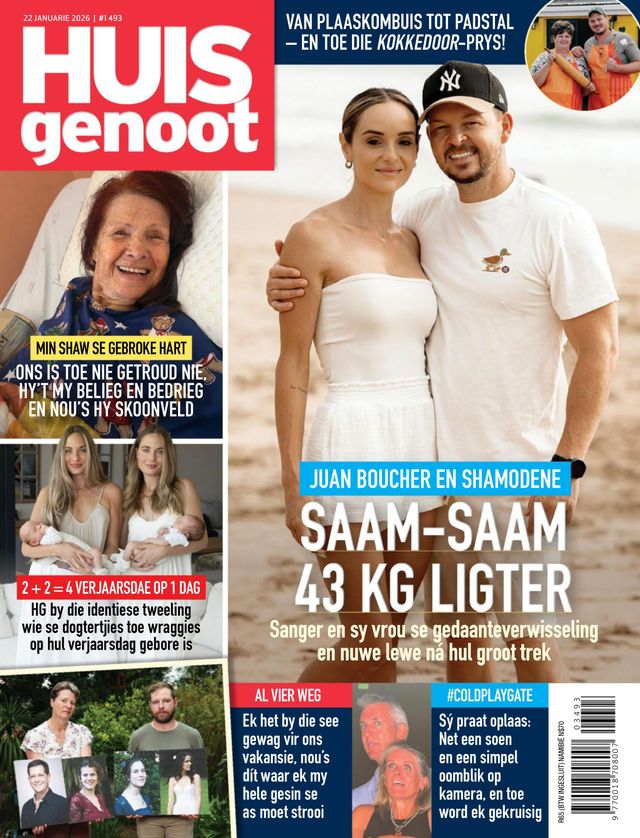 In hierdie uitgawe van Huisgenoot: Juan Boucher en Shamodene - Saam-saam 43kg ligter - Sanger en sy vrou se gedaanteverwisseling en nuwe lewe ná hul groot trek; Min Shaw se gebroke hart - Ons is toe nie getroud nie, hy't my belieg en bedrieg en nou's hy skoonveld; 2 + 2 = 4 Verjaarsdae op 1 dag - HG by die identiese tweeling wie se dogtertjies toe wraggies op hul verjaarsdag gebore is; Al vier weg - Ek het by die see gewag vir ons vakansie, nou’s dít waar ek my hele gesin se as moet strooi en #Coldplaygate - Sý praat oplaas: Net een soen en een simpel oomblik op kamera, en toe word ek gekruisig.