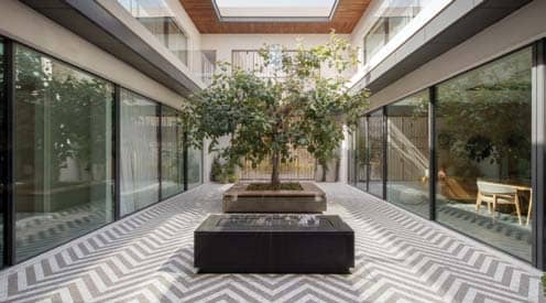 This courtyard is the key architectural organisational element, providing visual relief and spatial hierarchy. An ornamental tree provides shade while a water feature’s trickling sound permeates the space. The courtyard also serves as a break-out area from the formal dining room and other areas, with the dramatic floor and tiling adding a further ornamental element.