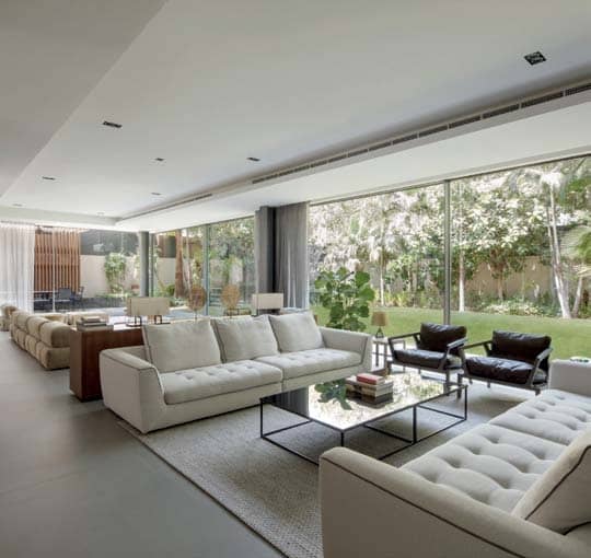 A simple timber-clad gate within a portico signals the entrance to this elegant residence in Jumeirah, Dubai, which from the street is understated and discreet. The perimeter fence is designed to integrate with the overall architectural composition: the slots in the fencing are reflected in the elegant lines of the architecture, punctuated with slot windows through which dappled light penetrates.