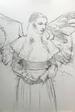 The inspiration for this new painting that I am working on for my solo show in December with Arcadia Contemporary is from the work of 19th-century artist, Abbott Handerson Thayer. I have painted winged figures before, and I originally started adding the wings to my figurative portraits to enhance the background designs.