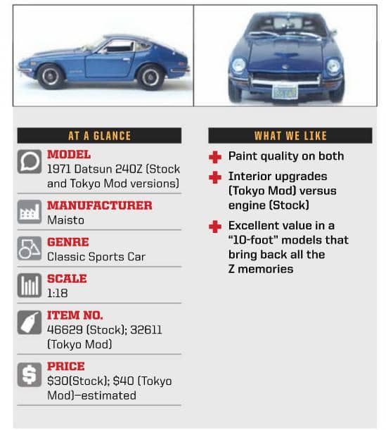 One of the traits that defined the original Datsun 240Z, and one of the things that made it so successful right from the outset, was its value proposition. Datsun had made its reputation selling affordable, reliable, value-oriented economy cars that tended to outperform their modest prices. The Z represented an ambitious step up into the performance car arena, but it was not a fundamental shift in the brand philosophy. The Z also emphasized solid value. It was launched with a sticker price of around $3500—roughly the same as a Triumph TR6, MGB GT, or even a Porsche 914 of the same vintage. But thanks to its light weight, excellent balance, and energetic inline-6 it performed as well or better than all of those, and offered substantially better reliability to boot. And, it was a stunner in the looks department— something Datsun was not necessarily known for. Maisto role in the diecast industry is a bit like Datsun’s was in the car world back in 1970. The company reliably delivers affordable, valueoriented scale models that often outperform their modest prices. To that they add an impressively diverse range of models both classic and modern. Traditionally most of Maisto’s offerings have been in factorystock configuration, but more recently they have expanded that to include custom-tuned versions of several of their castings under the ‘Maisto Design’ banner. Because I have a love affair with the Z that traces all the way back to the car’s debut I wanted to take a look at the two versions of the Z that Maisto has to offer and see how they measure up.