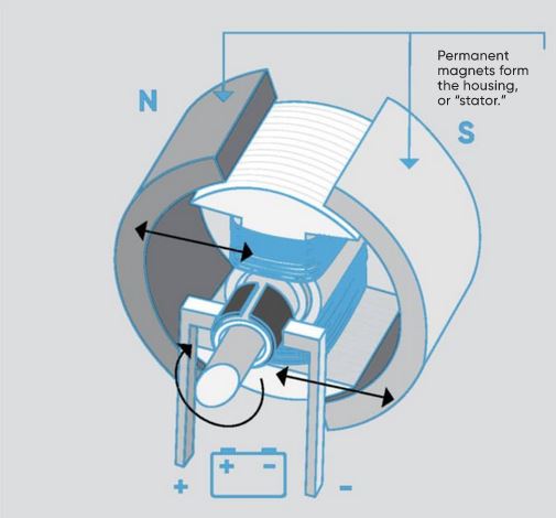 Copper windings form an electromagnetic rotor; direct current is applied via brushes that contact the commutator (black), which switches the electromagnet’s polarity every revolution to keep the motor spinning.