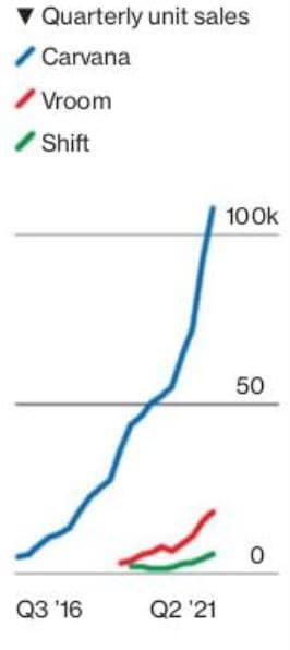 The used-car market has gone crazy over the past year, as social distancing and a global computer chip shortage have upended the auto industry, and companies such as Shift are thriving. The 3-year-old startup sold 10,323 vehicles in the first half of this year, triple the level of the same period in 2020. Vroom Inc., a competitor, doubled its business, selling almost 34,000 cars and trucks over the same period, while Carvana Corp., the largest of the used-car web dealerships, sold 200,272 vehicles, a company record.
