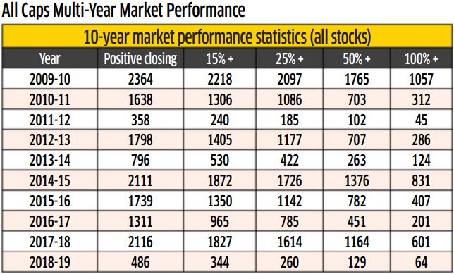If we look at the above table, we find that on an average, at least 1471 shares have given positive returns every year. The average number of stocks that have delivered 15 per cent and more in one year is 1205, while the average number of stocks that delivered 25 per cent and more returns in one year is 1049. As many as 744 stocks have on an average generated returns in excess of 50 per cent, while the number of stocks that have delivered more than 100 per cent returns on an average in one calendar year is 392.