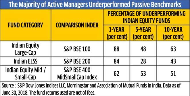 Passive investment is attracting more and more funds compared to active funds. In one of the reports by Emerging Portfolio Fund Research (EPFR), a company that provides fund flows and asset allocation data, between 2007 and 2018, the Asset under Management (AUM) of passive funds has increased from USD 700 billion in the year 2007 to USD 3.9 trillion in 2018, showing an annual growth of 19 per cent. One of the reasons for such a rise in the passively managed funds is their performance. In a 10-year period in USA market, 89 per cent of the actively managed funds underperformed the passive funds. In case of mid-cap and small-cap dedicated funds, almost 93 per cent actively managed funds underperformed passively managed funds.