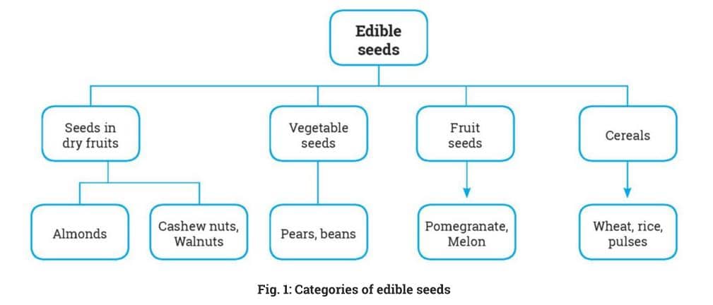 A seed is a small embryonic plant that is enclosed in a covering called seed coat and contains the stored food in the form of carbohydrates like glucose, sucrose, starch, etc. The seed consist of mainly three parts i.e embryo, endosperm and testa. The endosperm is a collection of stored food that the young plant uses to grow. The embryo is called ‘baby’ of the seed which develops into a new plant while testa is the outermost layer of the seed which protects the endosperm and embryo from damage through outer environmental factors. In plants, the seeds are of two types- naked seeds which are present in gymnosperms like pine, cycas, etc. that do not develop into flowering plants. On the other hand, seeds found enclosed within the fruit develop on flowering plants called angiosperms. Some of these seeds are edible and some are not edible but give rise to new plants when grow in the soil. The edible seeds include seeds in dry fruits like-almonds, cashew nuts, walnuts, etc.; vegetable seeds likepears, beans etc.; fruit seeds likepomegranate, melon etc.; cereals like wheat, rice, pulses, etc. (Fig. 1).